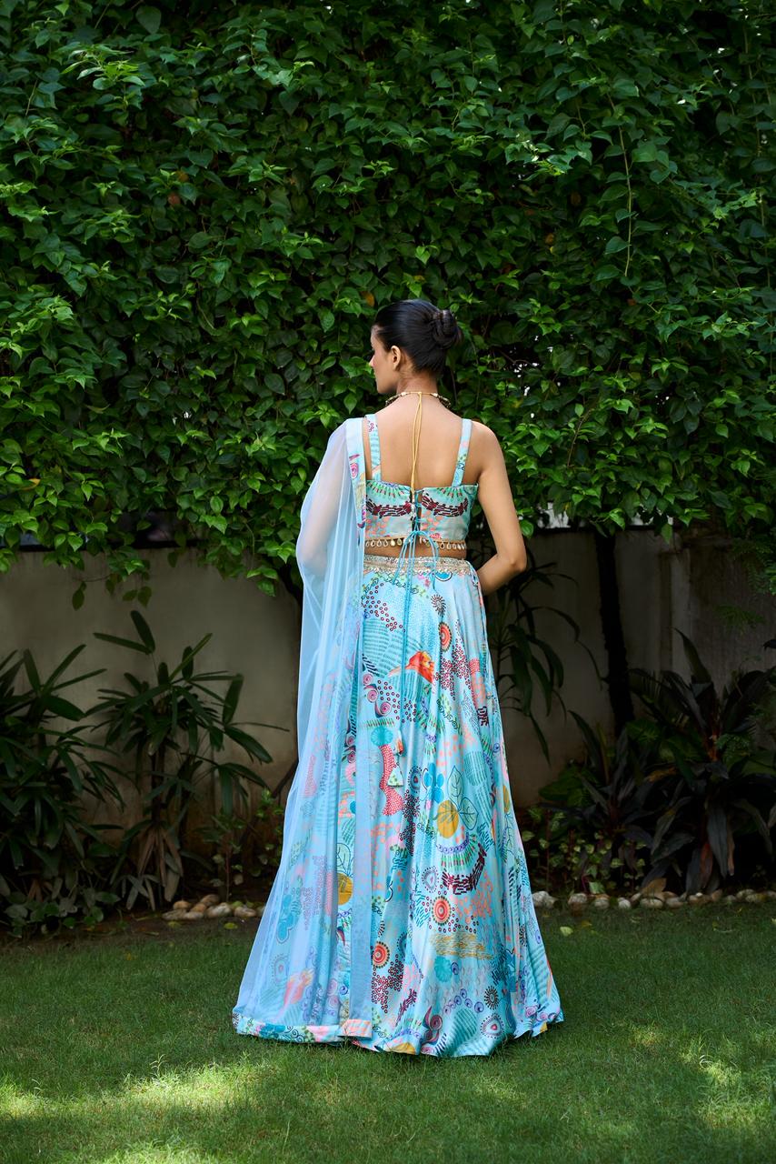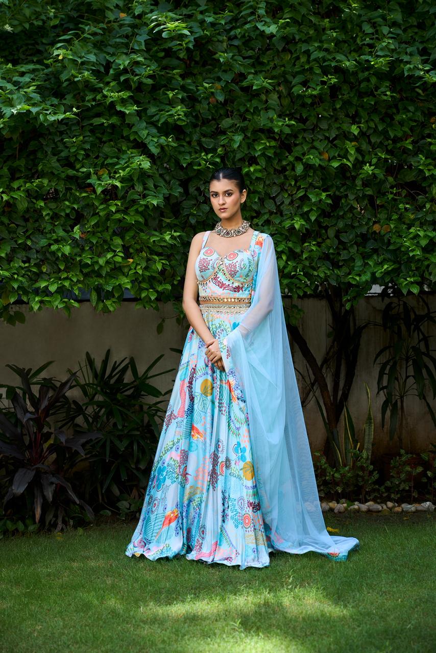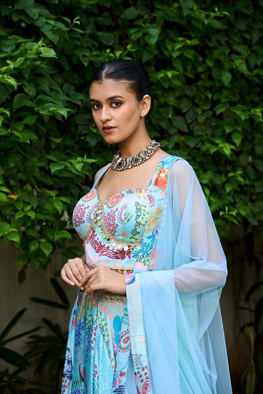 Drift into effortless elegance with our Ocean Breeze Lehenga, a celebration of color, movement, and modern femininity. Crafted in airy aqua hues with playful multicolored prints, this ensemble captures the essence of a seaside dream. The fitted, intricately embellished blouse pairs beautifully with the voluminous, swirling skirt that moves like waves in motion. Finished with a delicate dupatta.