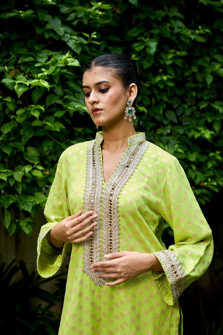 Crafted in soft georgette and adorned with delicate bootie motifs, this corset-style set captures effortless festive charm. The silhouette is elevated with hand-detailed gota borders along the neckline, sleeves, and hem, making it perfect for daytime celebrations or intimate festivities.