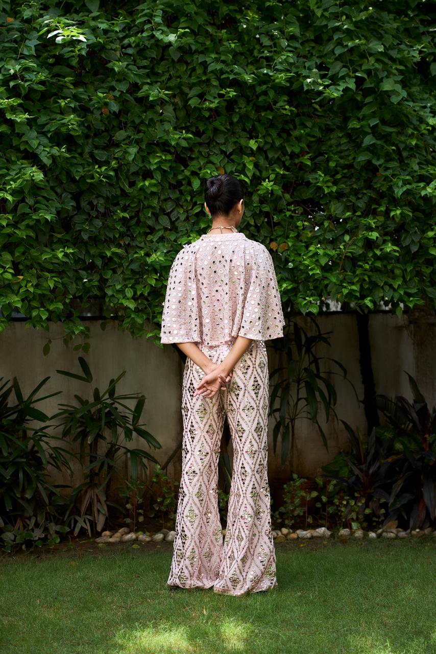 A stunning Georgette Mirror Work Set that blends elegance with comfort. The outfit features a beautifully handcrafted cape adorned with delicate bead detailing, paired with a mirror-embellished blouse and flowy pants for a graceful yet contemporary look. Perfect for festive occasions, weddings, or evening celebrations, this ensemble adds effortless glamour to your wardrobe.