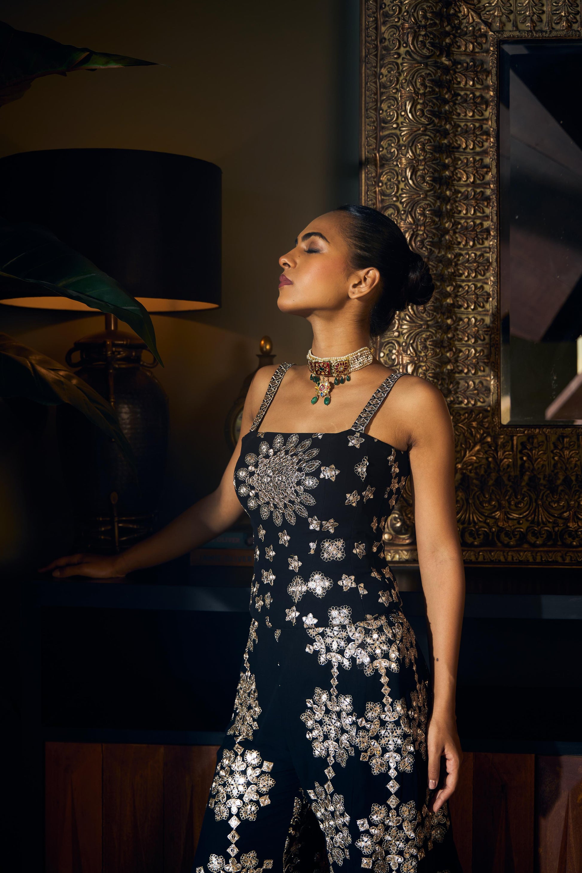 Exude timeless elegance in this black embellished ensemble, adorned with intricate silver embroidery and a flattering silhouette. Perfect for evening soirées, it effortlessly blends modern sophistication with regal charm.